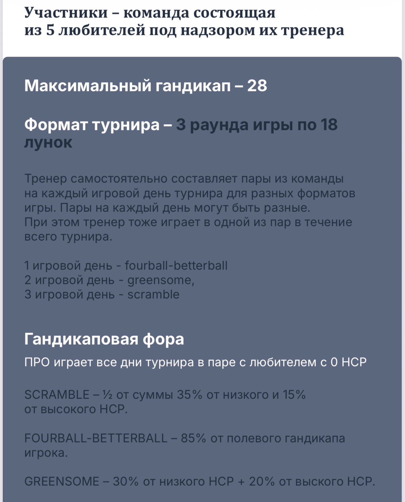 • Ограничение по гандикапу: 28.