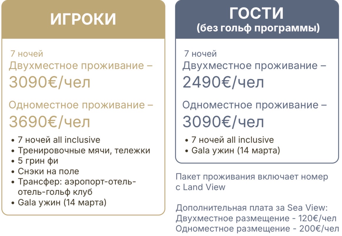 Стоимость для гостя (не игрока) — 2490/3090 € с человека.