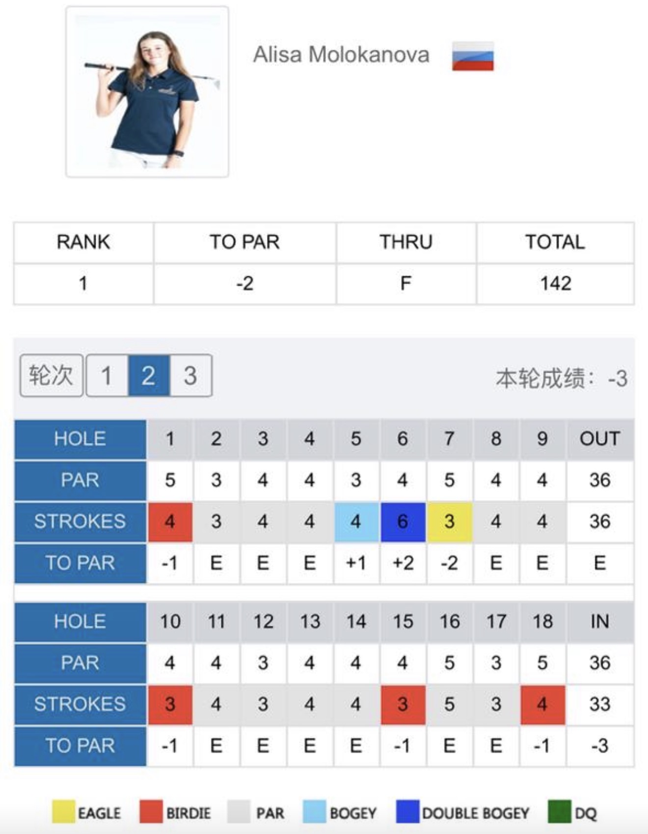 Во втором раунде 2026 FCG Callaway World Championship в Чэнду Алиса Молоканова сделала четыре берди, один игл, а также богги и один даблбогги