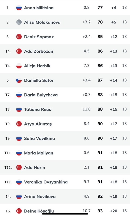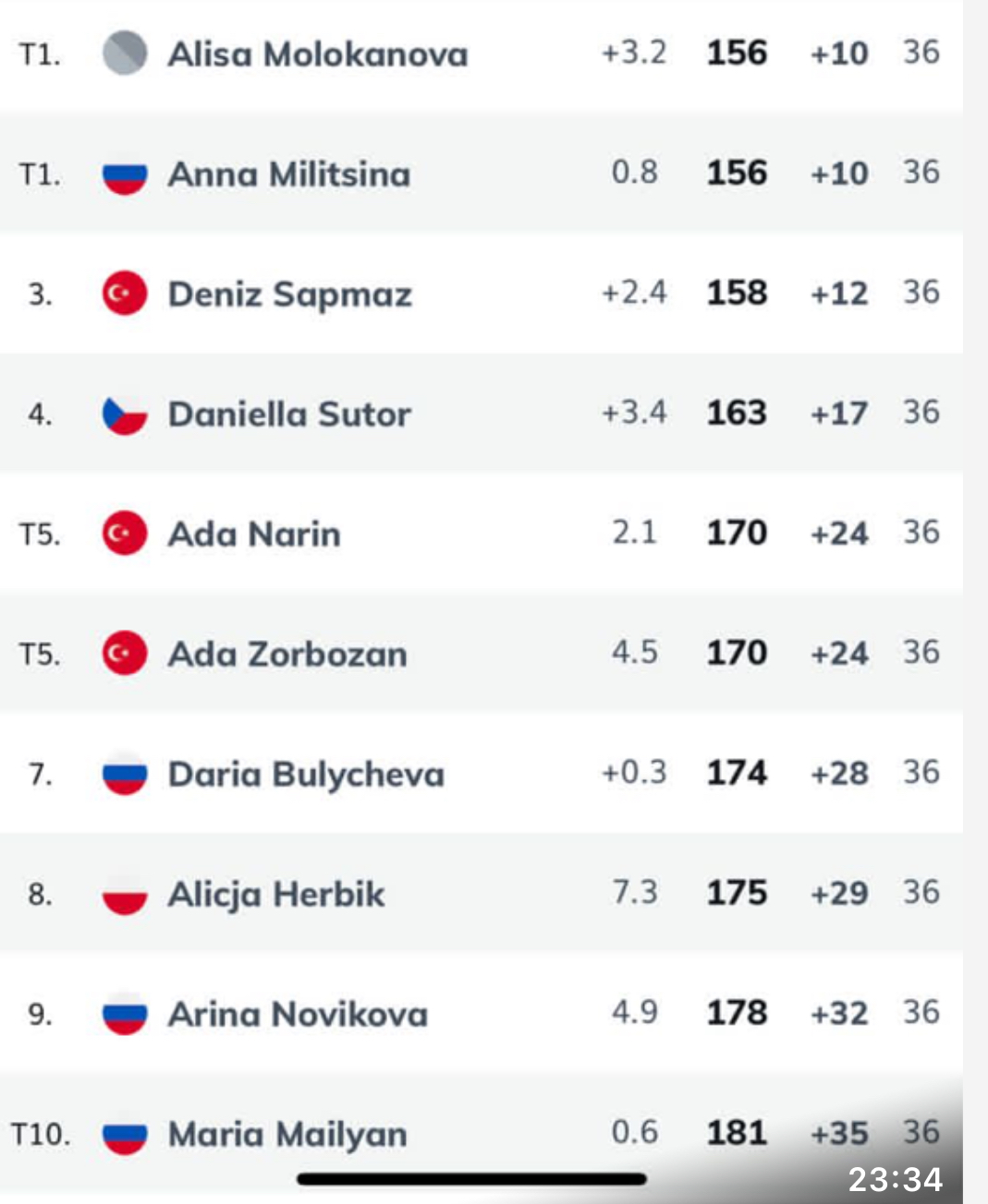 В женском зачете первое место разделили Анна Милицина и Алиса Молоканова. Дарья Булычева на 7-ой строчке с результатом +28. Арина Новикова девятая, Мария Маилян разделила Т10.