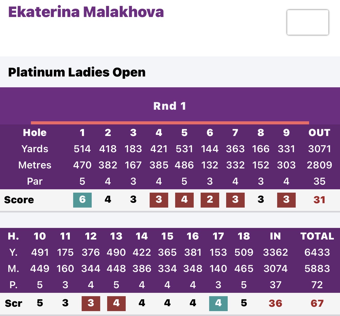 Многократная чемпионка России Екатерина Малахова, спортсменка сборной команды Московской области отлично стартовала на турнире. Она сделала семь берди при двух богги.