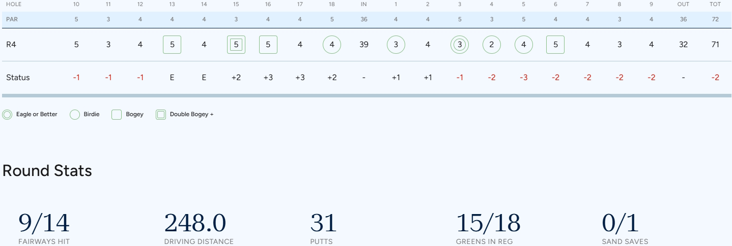 В финальный день Наталия Гусева стартовала со второй девятки и закончила ее со счетом плюс 2. На второй девятке Наташа собралась и выбила три берди и один игл и с общим счетом минус два завершила турнир на Т51.