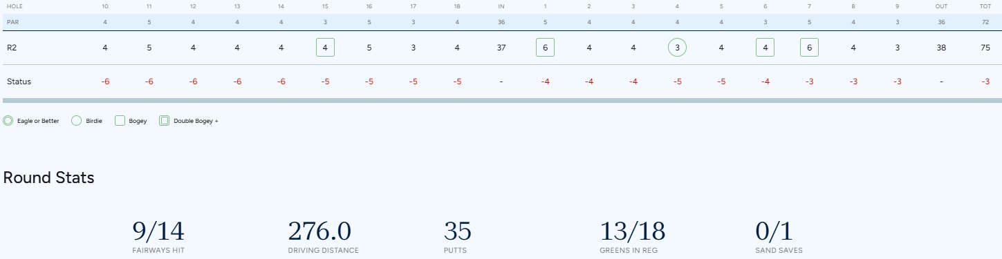 Против вчерашних 26 паттов, сегодня Наталия Гусева сделала 35 ударов на грине. С общим счетом минус три Наташа делит 38-ю строчку турнирной таблицы. Кат прошел по отметке минус два.