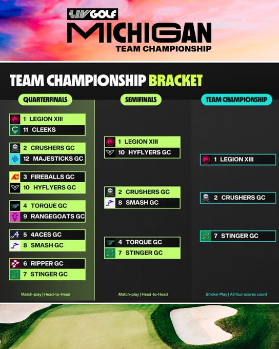 В LIV Golf завершили свой четвертый сезон параллельно с главными конкурентами и провели командный турнир, по итогам которого были распределены 50 млн долларов. По итогам первого дня из двенадцати дружин в полуфиналы отправились шесть команд, сумевших одолеть своих оппонентов. В рамках каждого противостояния было проведено по два индивидуальных поединка и один матч, в котором от каждой команды выступали по два участника.