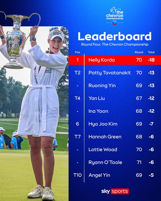 Нелли Корда (Nelly Korda) одержала уверенную победу на мейджоре Chevron Championship, где она в итоге опередила своих ближайших преследовательниц на пять ударов. Нелли захватила лидерство с первого дня и в дальнейшем не покидала вершину турнирной таблицы (wire-to-wire). Сама гольфистка призналась, что из-за внушительного отрыва ей приходилось постоянно себя одергивать по ходу финального раунда.