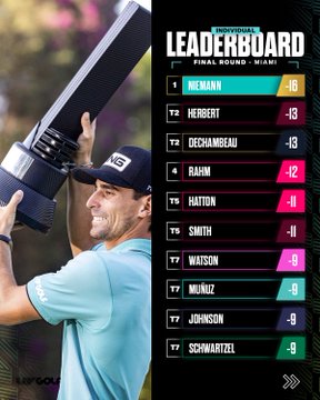 В заключительный день состязания Брайсон не сумел выступить лучше пара, чем незамедлительно воспользовались его конкуренты. Хоакин Ньеманн (Joaquin Niemann) отвоевал у местной арены сразу шесть минусов, оформив свою очередную победу в текущем сезоне. 28-летний чилиец в этом году выиграл уже три из шести стартов в Лиге саудитов, а общее число его побед в LIV Golf достигло пяти (делит рекорд с Бруксом Кепкой (Brooks Koepka)).