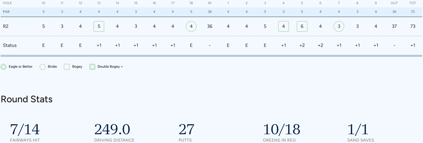 Сильнейшая российская гольфистка, спортсменка Московской области Наталия Гусева во втором раунде сделала два берди при трех богги и с общим счетом по сумме двух дней +1 делит Т64 турнирной таблицы.