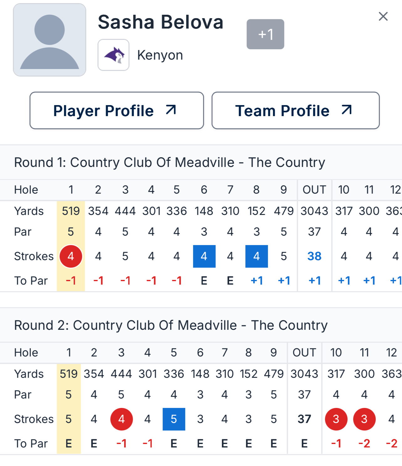 Саша сыграла первый раунд турнира со счетом +2, а во втором показала минусовой счет (-1). С итоговым результатом +1 Саша победила в индивидуальном зачете, что позволило команде ее университета завоевать третье место в командном зачете.