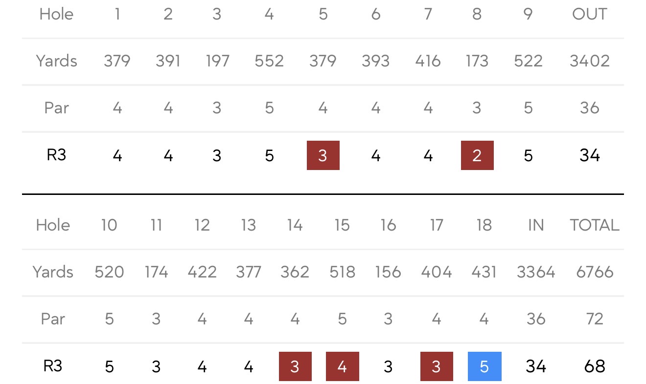 Егор Зотов показал сегодня свою лучшую игру на турнире. За две лунки до конца он сделал свой пятый берди, пройдя поле без единой ошибки. Но на последней лунке, это была лунка #9, так как Егор стартовал с 10-ой лунки, случился досадный единственный за сегодняшний день богги. Минус 4 за раунд и с суммарным счетом +4 Егор завершил турнир на Т29.