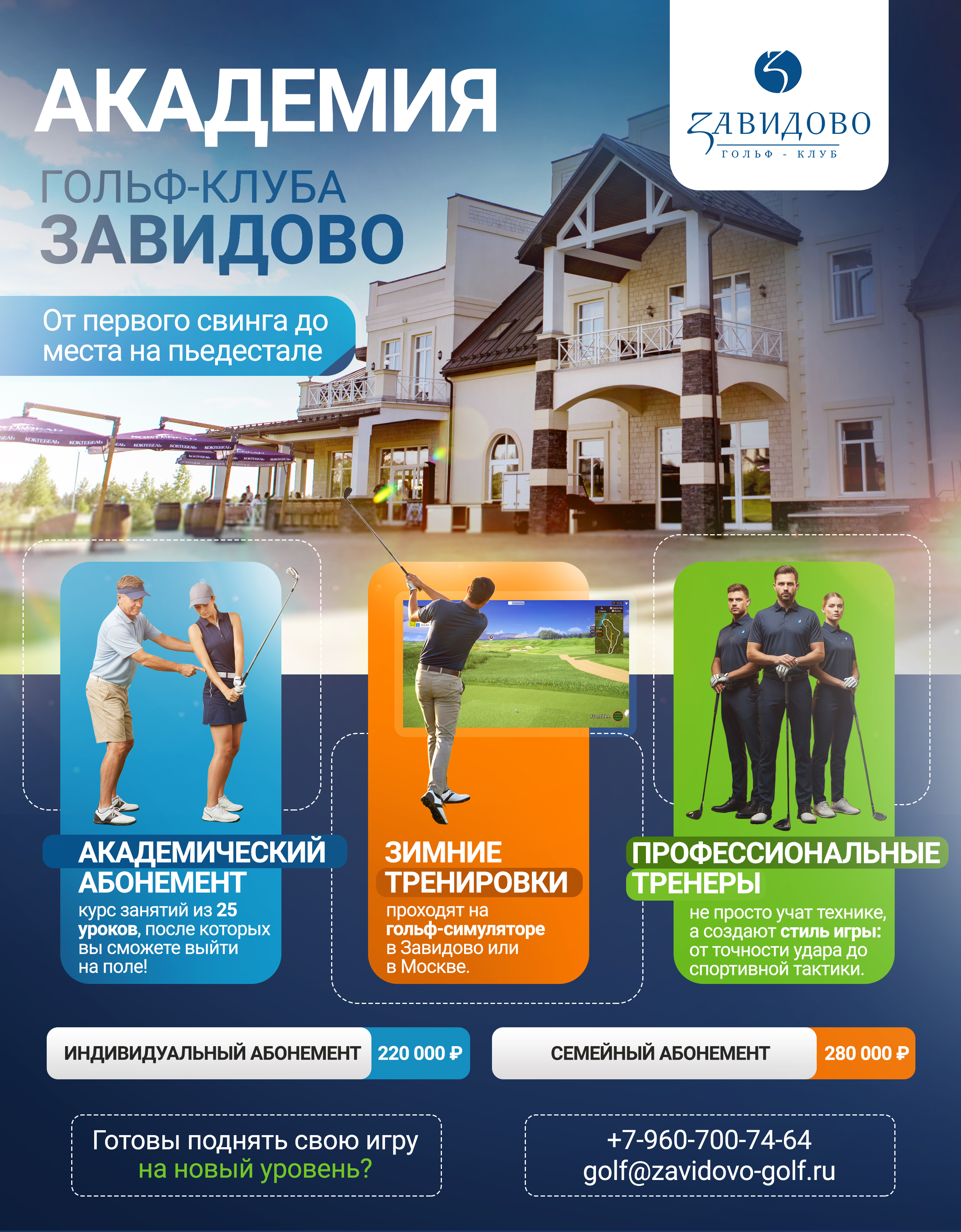 Академия Гольф‑клуба Завидово предлагает академический абонемент — структурированный курс из 25 уроков. По окончании курса игрок может выйти на поле и принимать участие в турнирах для новичков.