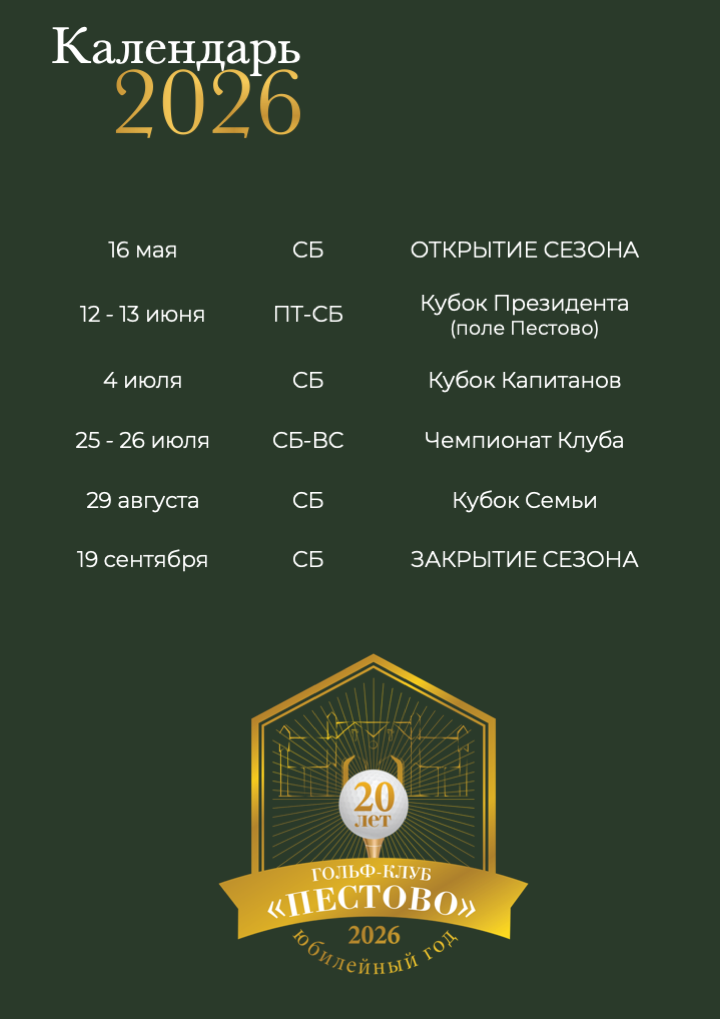 Календарь турниров гольф-клуба Пестово на сезон 2026