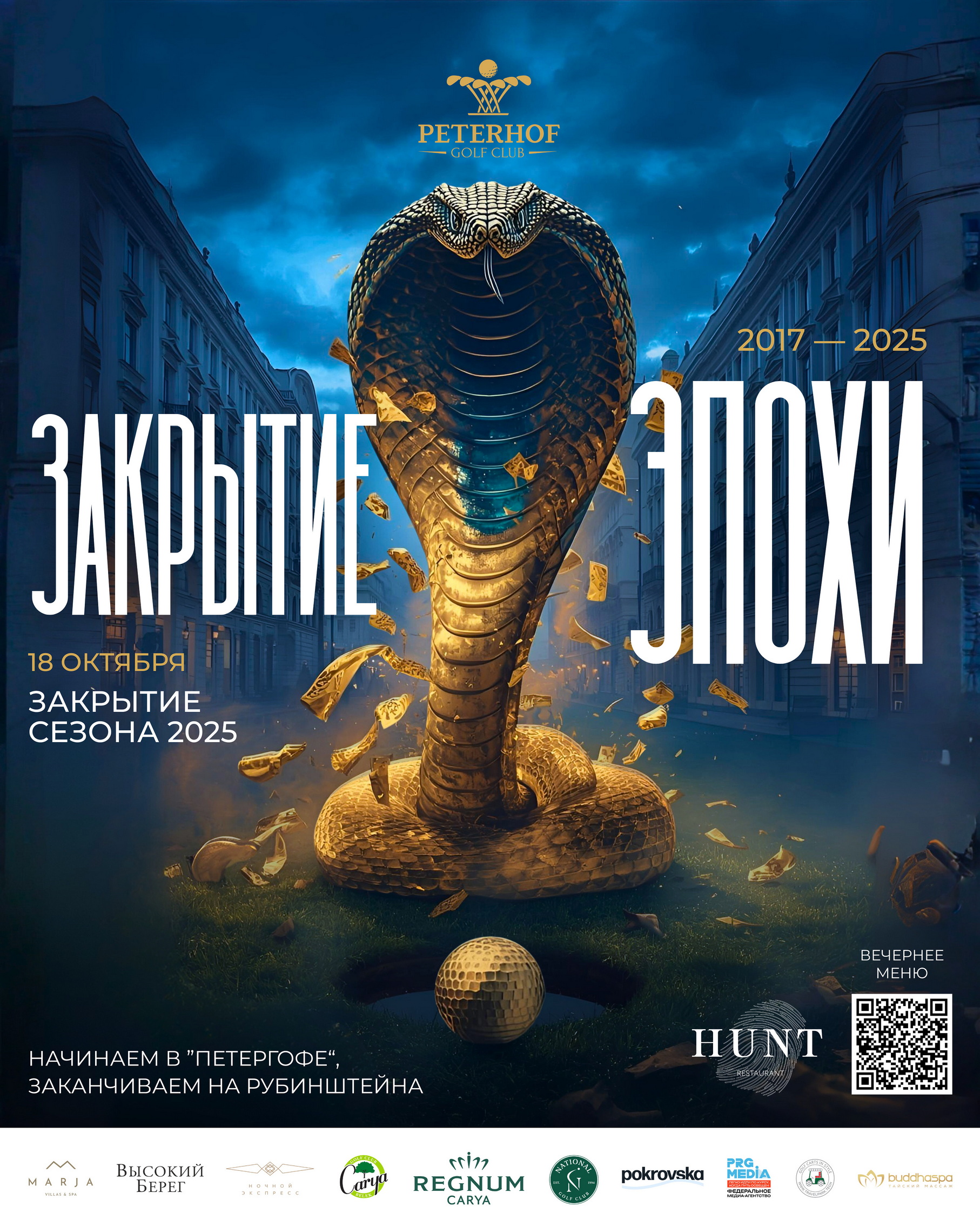 Закрытия гольф-сезона 2025 состоится 18 октября в «Петергофе», а церемония награждения победителей пройдет в ресторане Hunt на Рубинштейна!