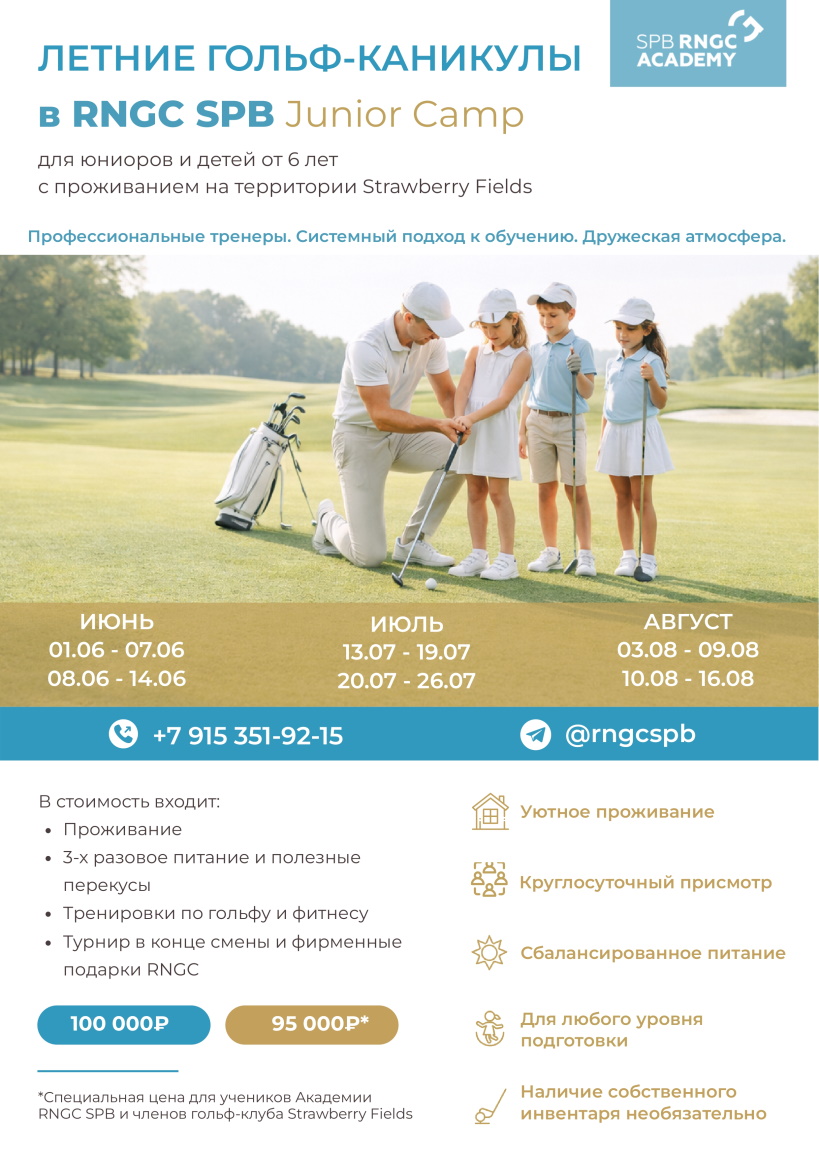 По традиции этим летом на юге Ленинградской области откроется детский лагерь Академии RNGC SPB совместно с гольф-клубом Strawberry Fields.